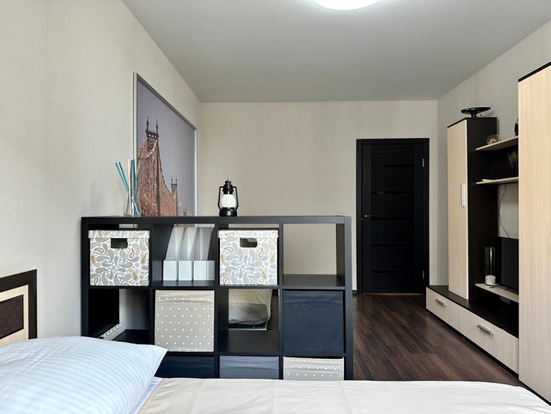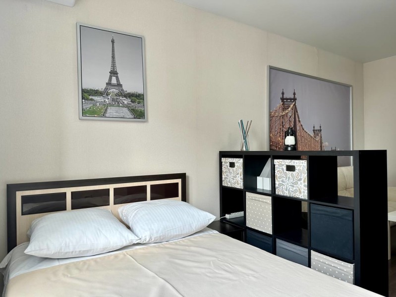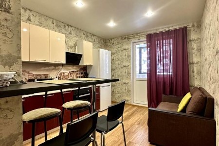 | Апартаменты 1-комнатные | 41 кв.м. | 5 чел. | Балкон (лоджия), Кухня, Мебель (вешалка, диван раскладной, зеркало, кровать двуспальная, стеллаж, ст... |